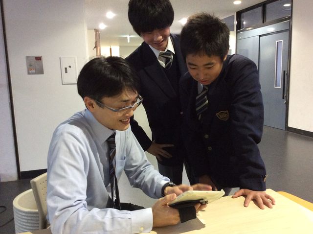 ロイロノートを開きながら担任クラスの生徒と会話を楽しむ岡部教諭。