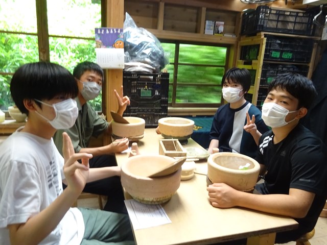 型取りし、コーティング液を塗ります。竹串で模様やメッセージを描く生徒もいました。みんな夢中に制作します。