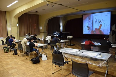 実際に画材道具を使ってマンガ技法を学びました。一人一人が集中し黙々と作業しました。