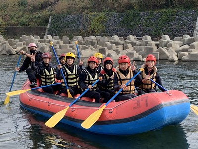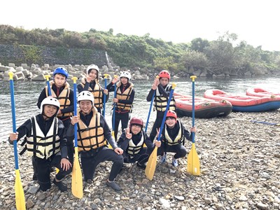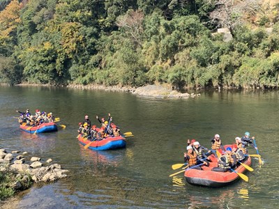 ・漕ぎ方を教えてもらったり水切りで遊んでいたらだんだん晴れてきてとても楽しいラフティングになりました。途中でボートを使ってシーソーをしたりボートを使って腹筋を鍛えたりするミニゲームもやり楽しかったです。