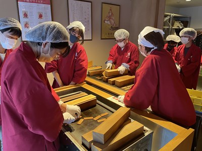 出来立ての八つ橋をおみやげにします。ラッピングに夢中です。
