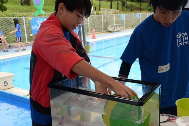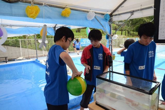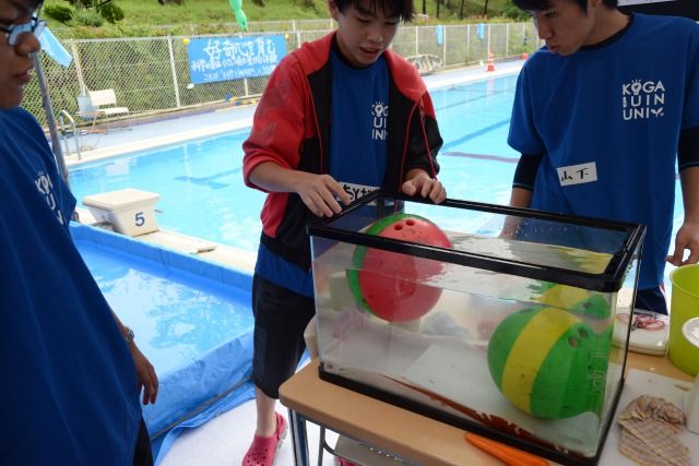 今日はボウリングの玉も実験に加わっていました。重いので、沈みそうですよね・・・。