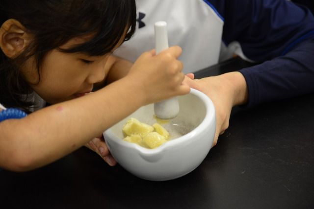 バナナを一生懸命つぶしてます。